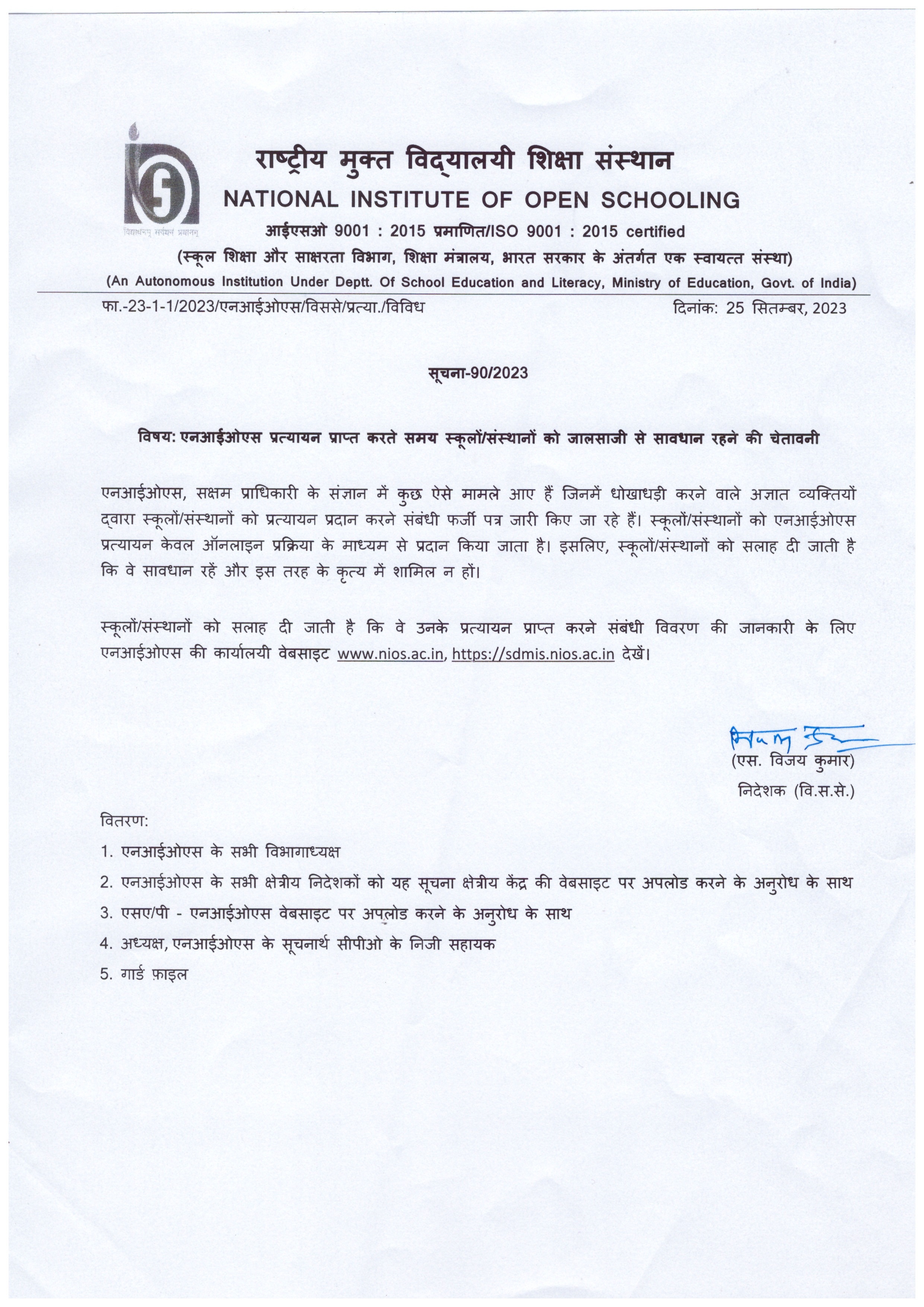 एन.आई.ओ.एस प्रत्यायन प्राप्त करते समय स्चूलों/संस्थानों को जालसाजी से सावधान रहने की चेतावनी
