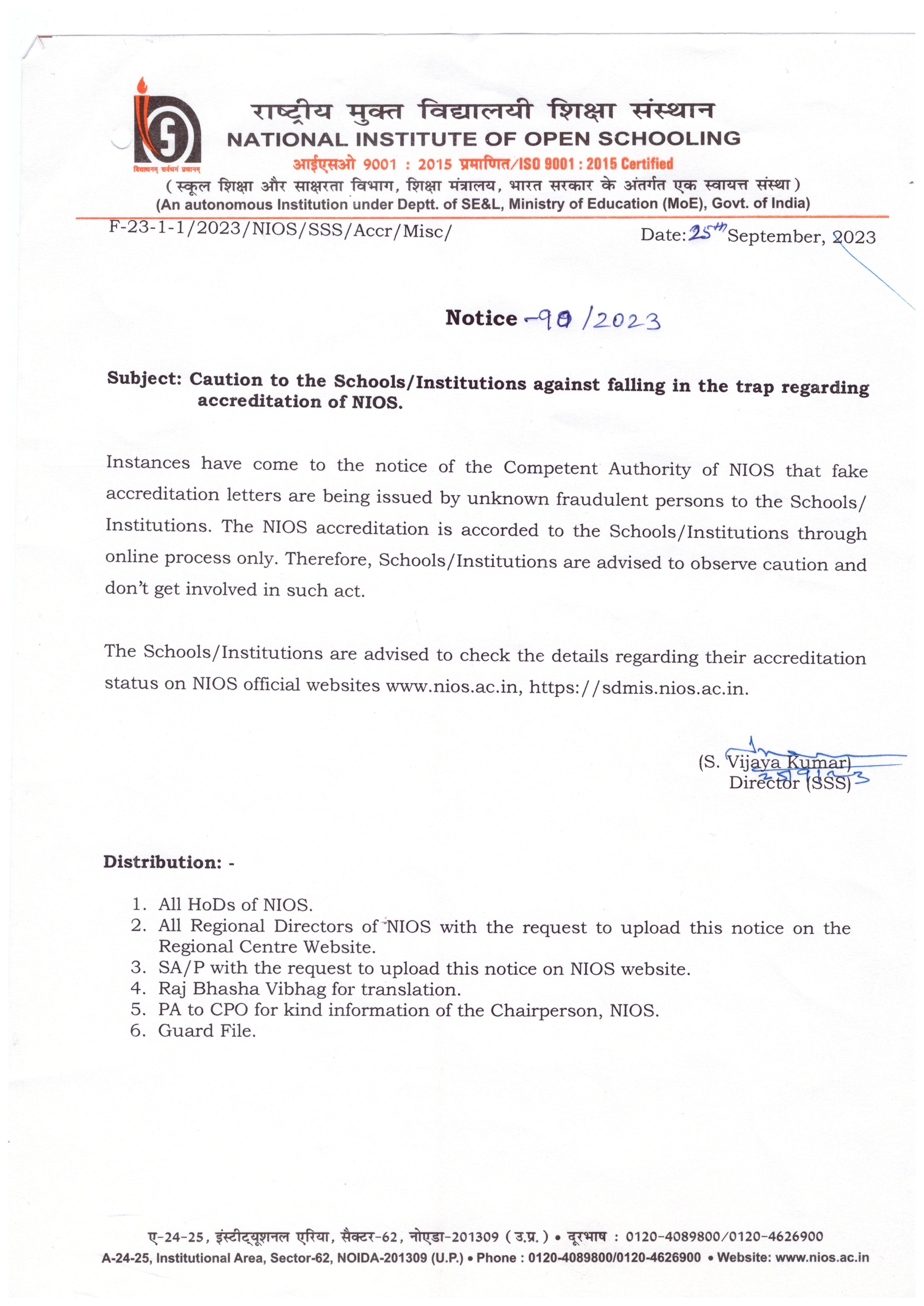Caution to the Schools/Institutions against falling in the trap regarding accreditation of NIOS_English